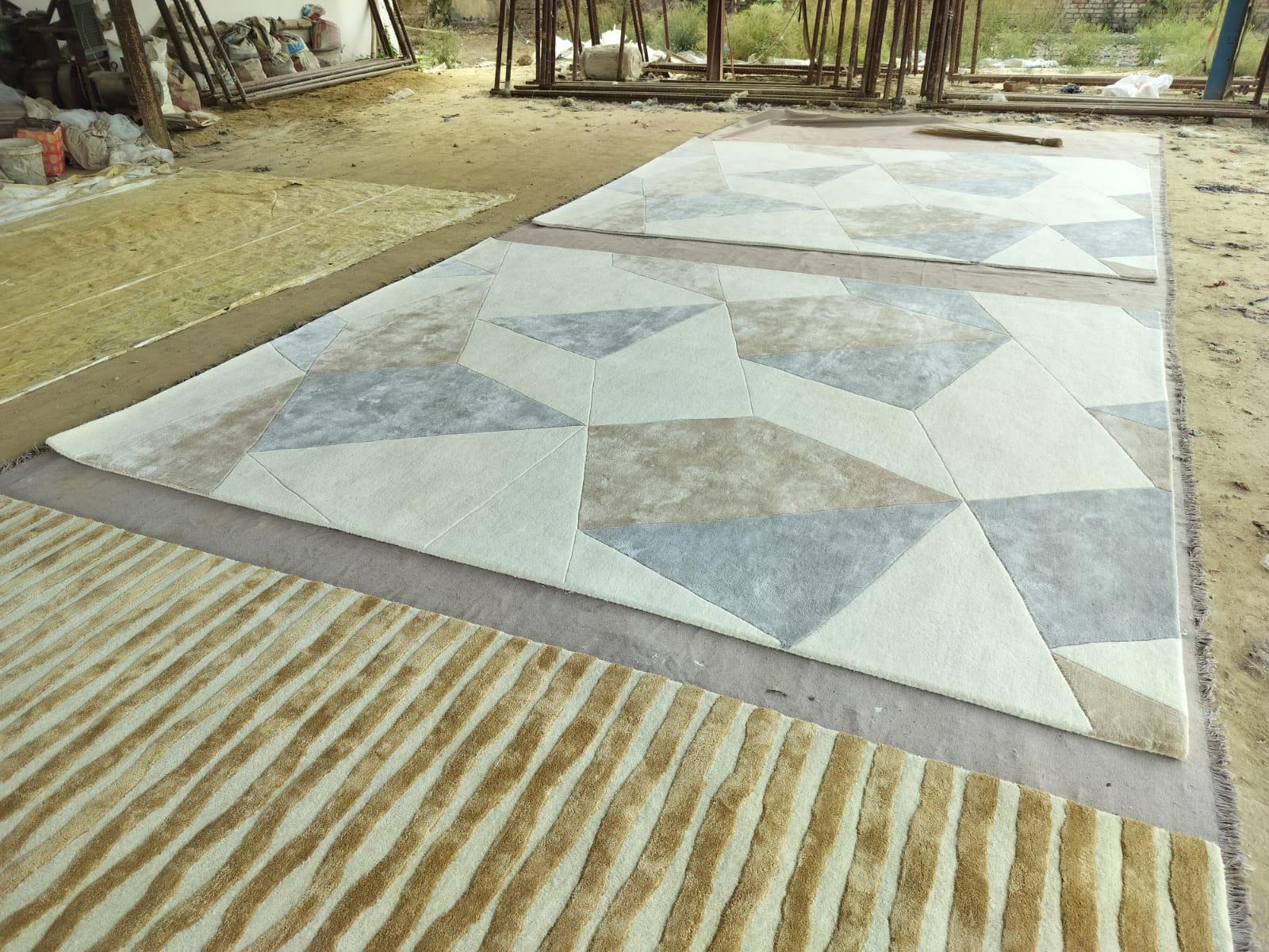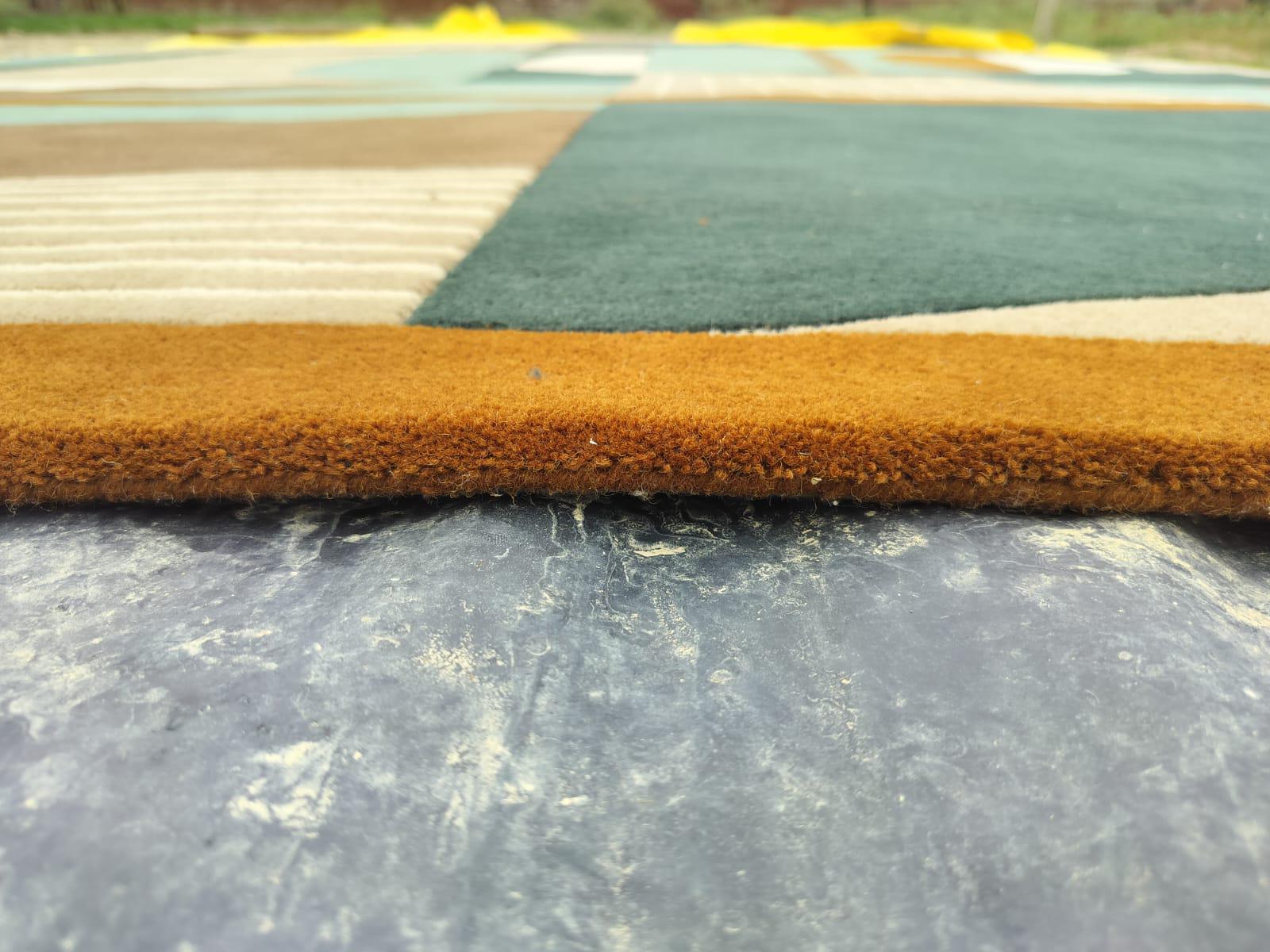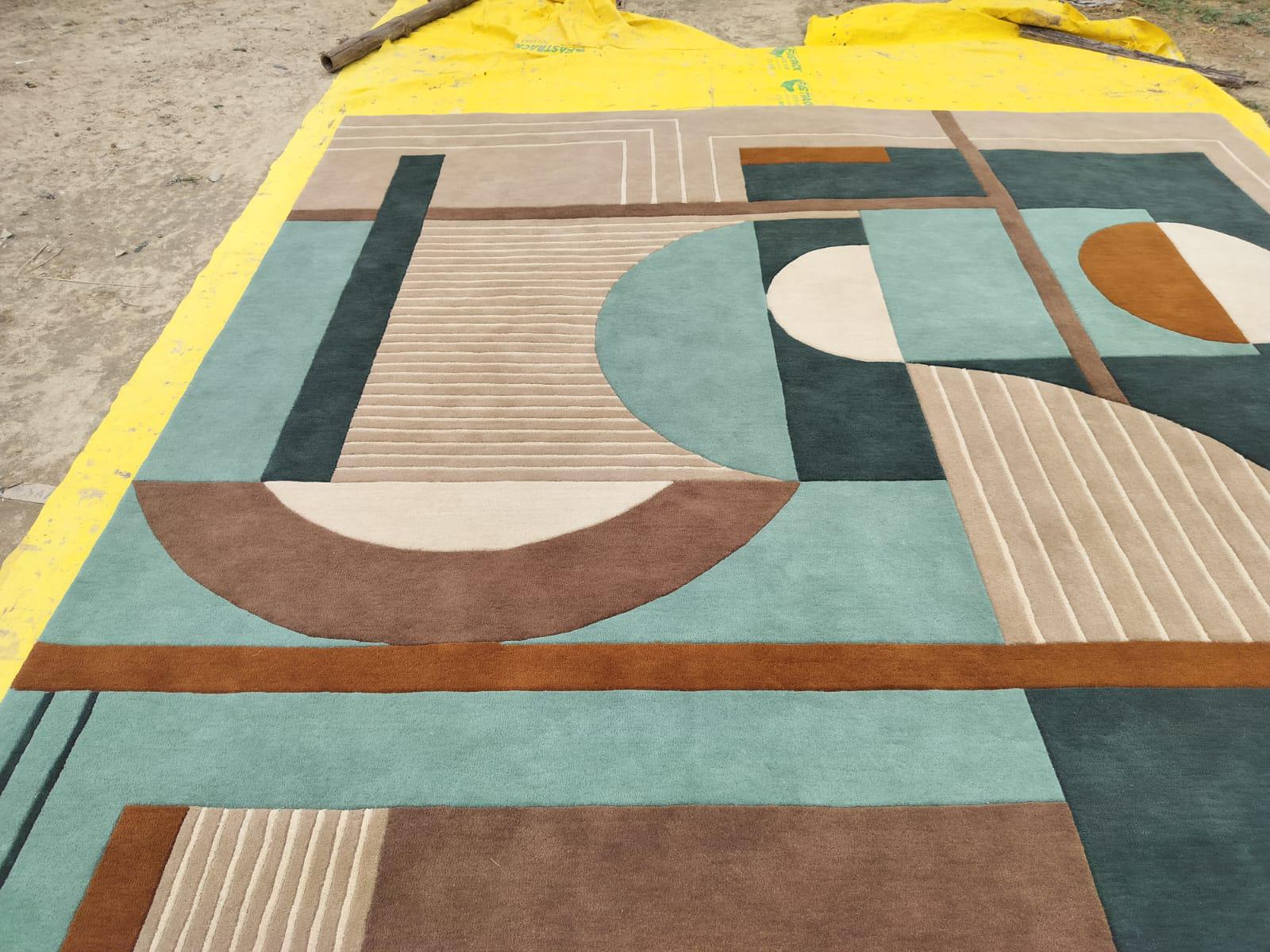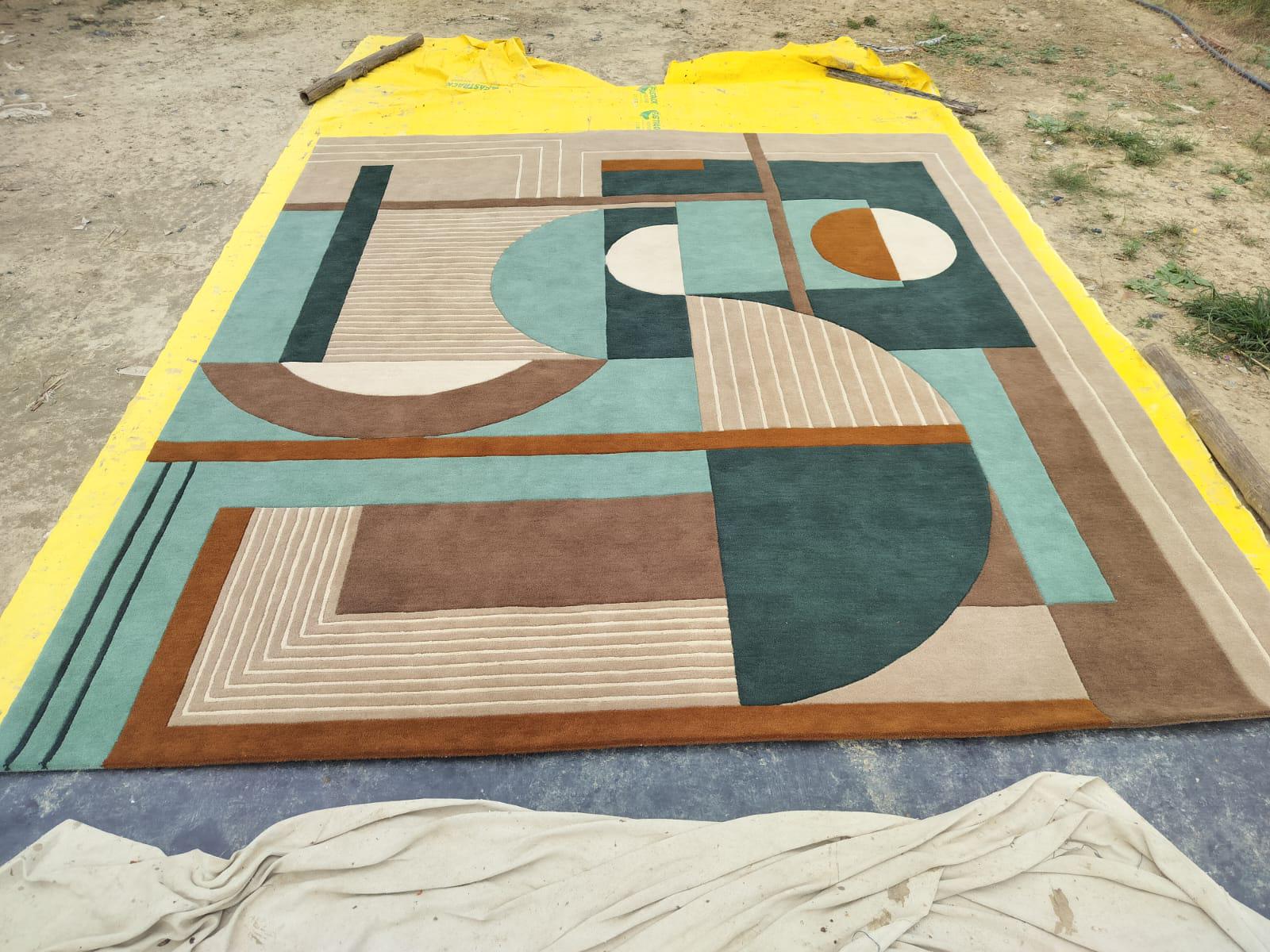 Hand-Tufted Modern Geometric Carpet. Bold lines and high-quality craftsmanship, ideal for home or office decor. backing white cloth