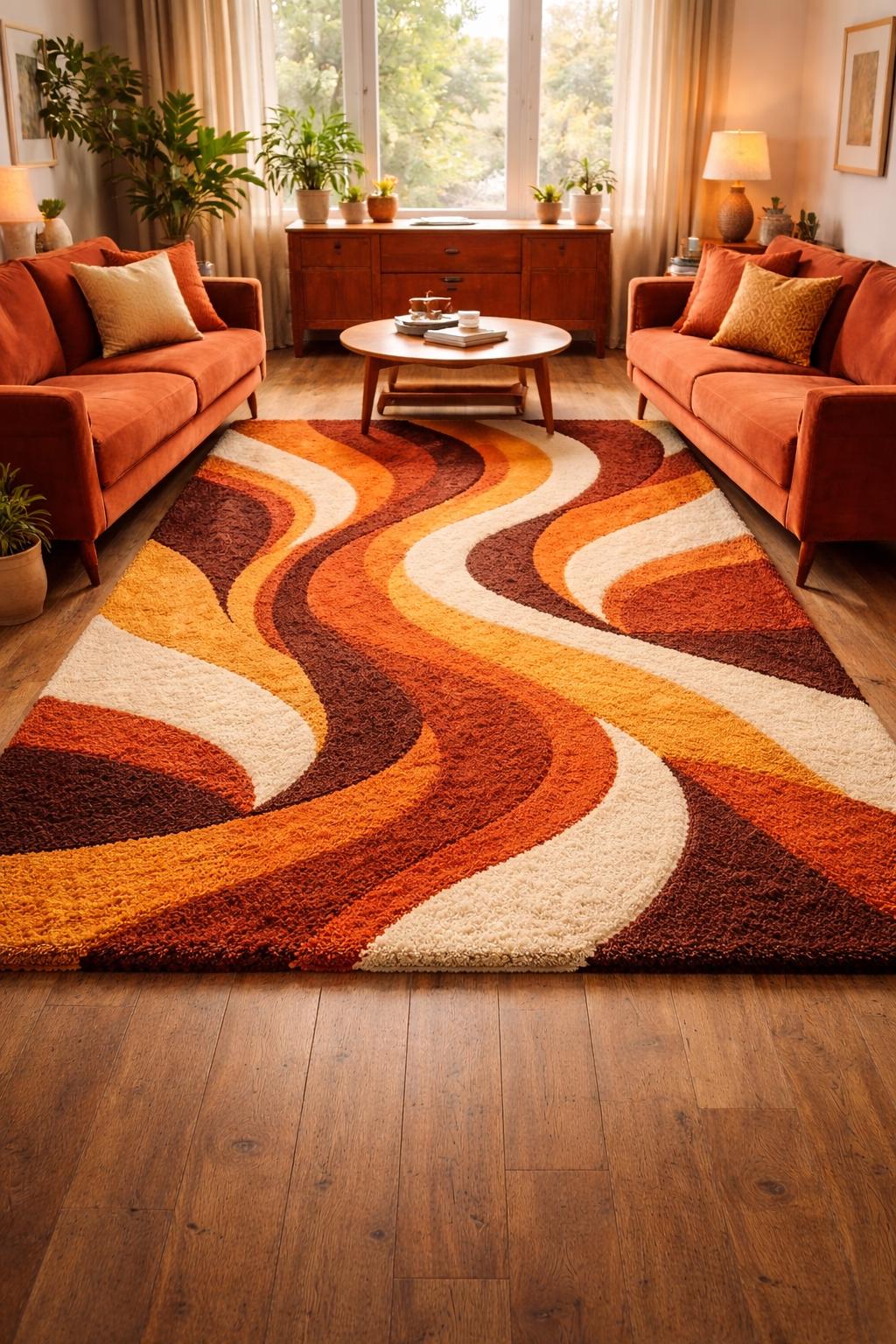 Modern Wavy Abstract Rug in warm tones. A plush hand-tufted statement piece that brings warmth and flow to your living room.